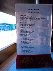 Like any other Asian restaurants, the menu is pretty long. They have a lot of choices and prices are very reasonable at about $ 10 – 15 for dinner servings. For anybody having a seriously big Japanese craving, they can choose from 4 gargantuan items on their All Day menu specials menu.