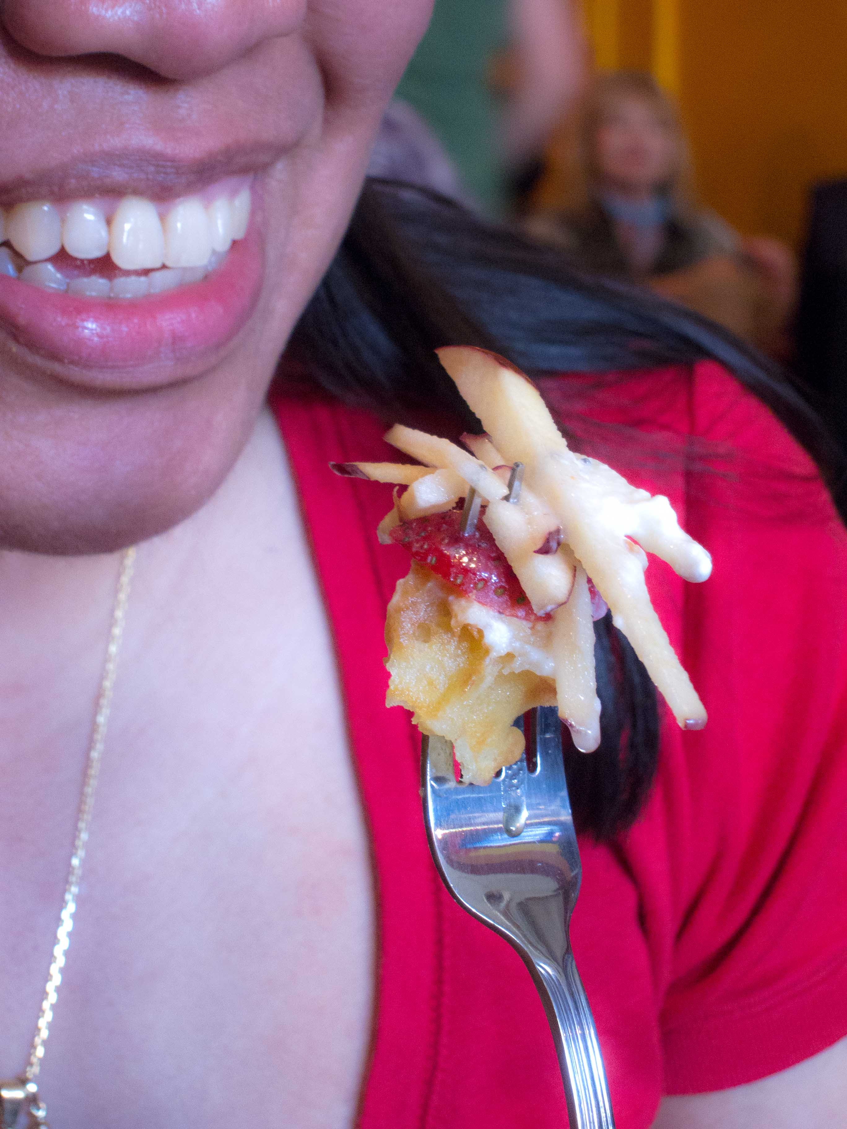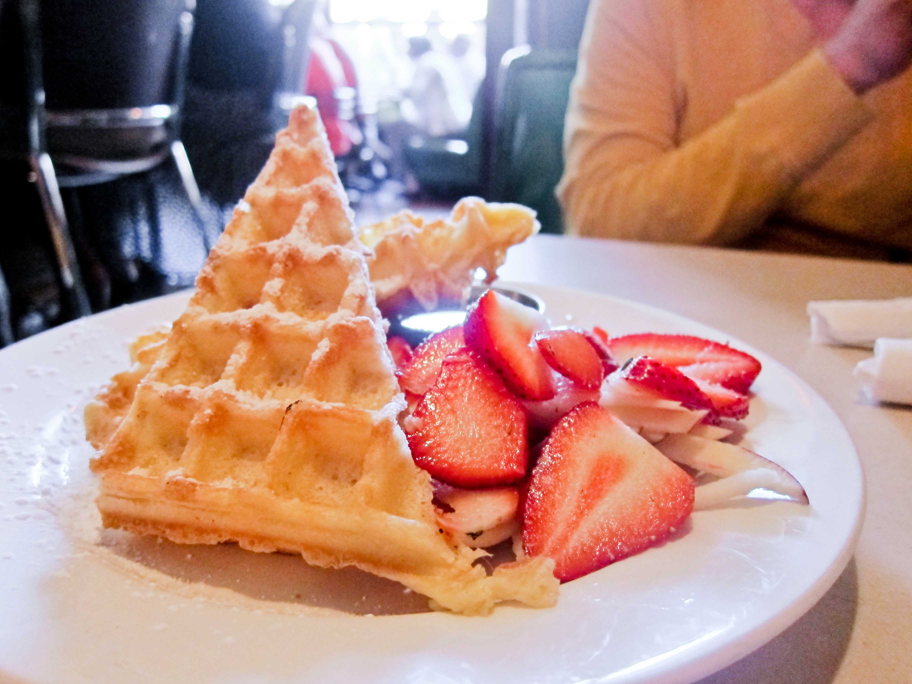 What’s my biggest surprise is Jojo suggesting we order the Waffle with strawberries. I was secretly lusting after it but thought it was too indulgent. When he suggested we just split one plate of it. Again, how can you say no? I know, I know, I should run the treadmill today for all I ate for my brunch but hey, it’s a Belgian place. Waffles should be ordered and savored! We didn’t have to wait too long and the plate arrives. It was a pleasant surprise of having a crunchy texture to the buttery, waffle. I sort of expected a doughy, pancake-like softness. I think I prefer this way of having my waffle from now on.