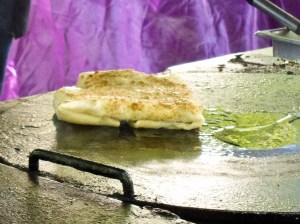 After much stretching and pulling, he then throws the dough to a cast iron round griddle which was earlier greased with ghee. I can imagine the richness of this dish as I see the man spoon a generous amount of beef filling on the center (you can also get it with chicken or vegetarian). Using a spatula, he expertly folds the sides of the dough and flips it to get a good crust on the top side. A few minutes more, he seemed content that the dough is aptly cooked and toasted, he slices through the square and divides it to four small squares for easy eating.