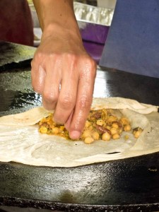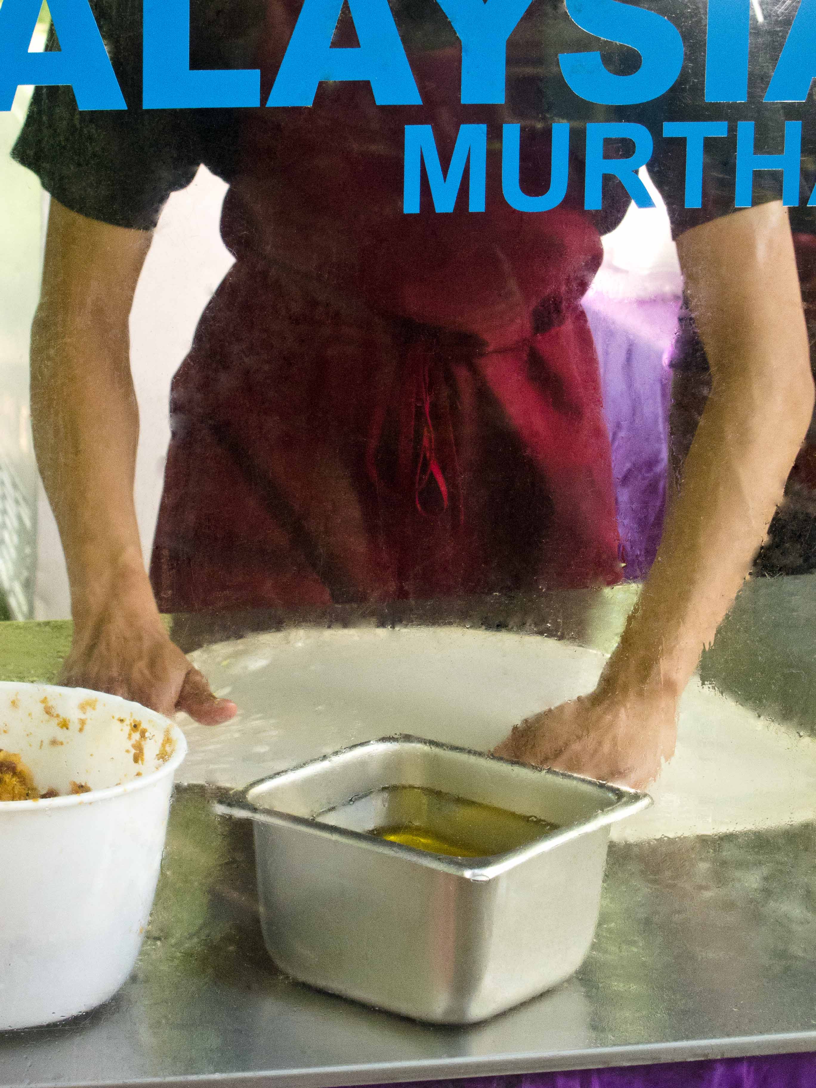 I watch in fascination as the food is prepared before me. Fresh elastic dough was piled high on a stainless work area. The man behind the table picks up one and stretches it very quickly, stretching it as if it’s a roti.