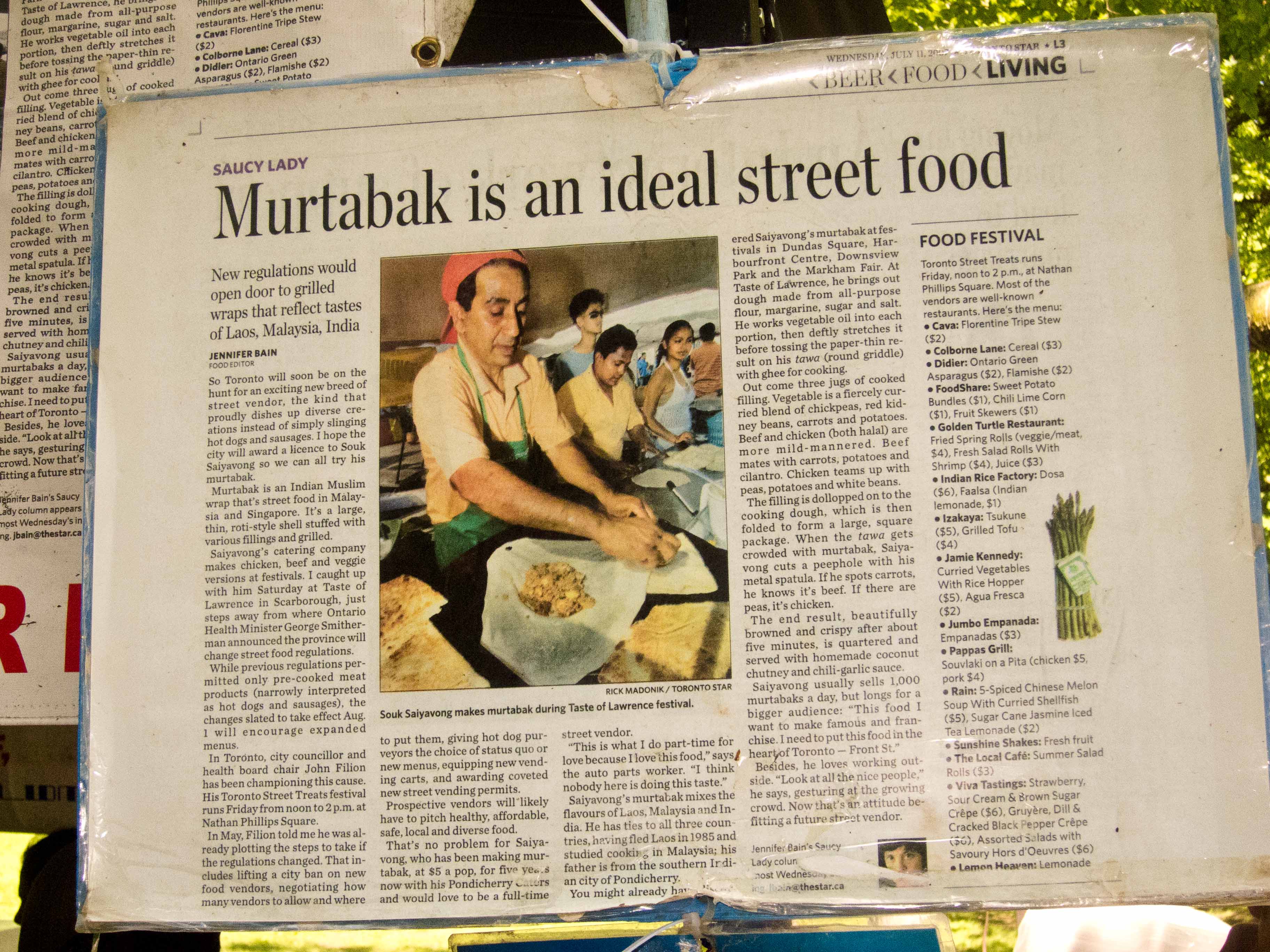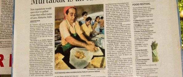 This time around though, my friend, Valerie, has had her heart set on one booth. It’s a Malaysian vendor with only one item on their menu, Murtabak. Murtabak is a roti-like wrap with curried meat or veggie filling inside. She once told me about her trip to Malaysia and she attests how this one is a filler. We approach the food stand and they have quite gregarious ads beckoning people to check them out. Amidst all that is a huge print out of an old article from the Toronto Star back in 2009, chronicling Pondicherry Caterer and their goal of getting Murtabak into mainstream food scene. I stand there and skimmed and scanned the article as Valerie buys us our share.