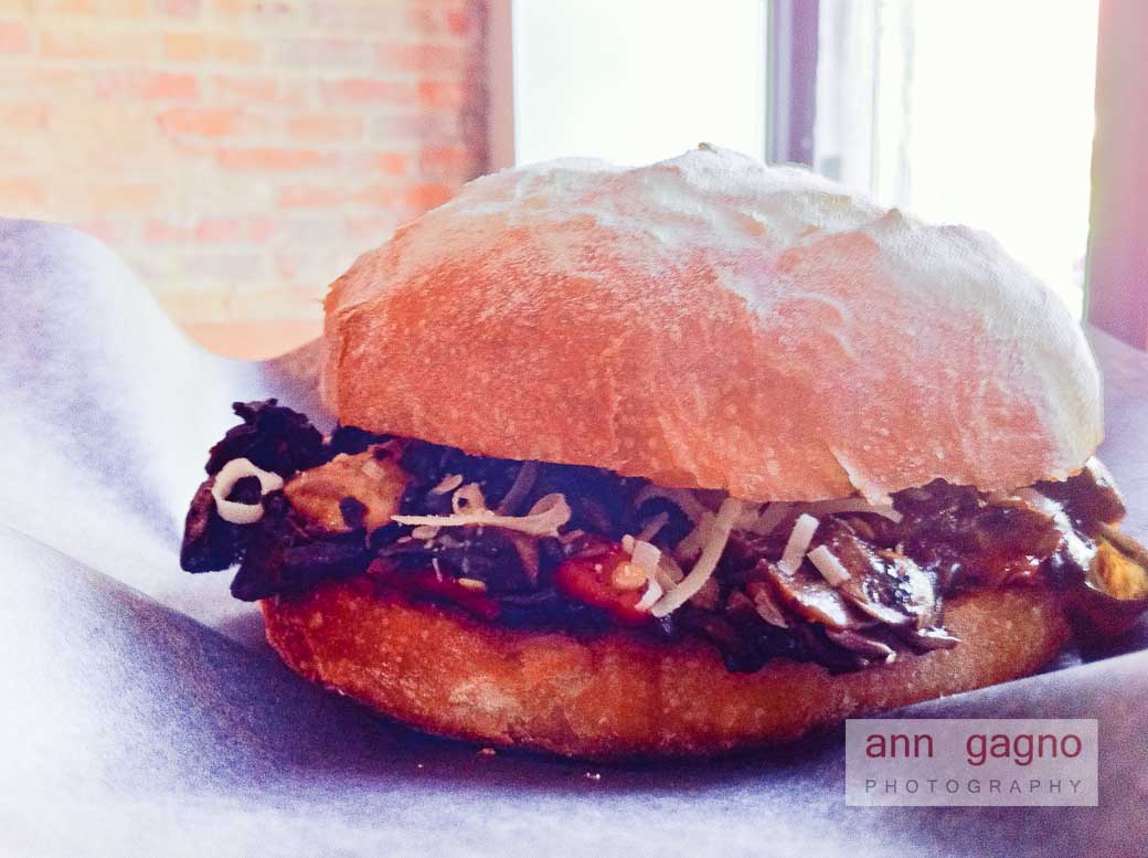 I walk in and I really liked how the interiors blended exposed brick and solid wood long tables. There is something about wood and tones of red that makes me feel comfortable and relaxed. The walls were also adorned with a gallery of B&W photography by a local artist. Moving closer to the counter, I see a big black board mimicking the menu I read outside and I found an immediate oversight. The first item in the menu caught my eye, the Dogfather. A sandwich laden with roasted or jalapeño peppers, mushrooms, cheese and tomato sauce with a selection of breaded chicken, veal or eggplant! I could never resist any dish with eggplant. I would take eggplant over any meat dish without a second thought. My tummy starts clamoring in anticipation as I waited for my sandwich. I think I found another foodie stop.