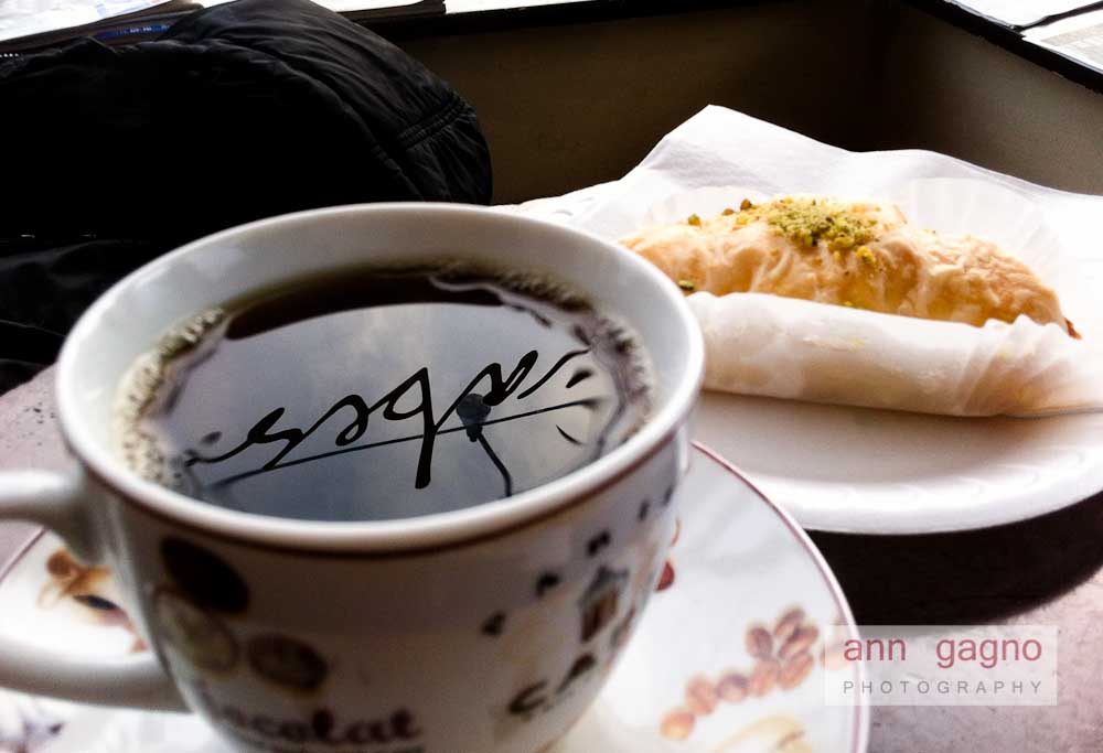 I approach the counter and I am amazed at the wide selection of middle eastern pastries. From my previous work, I am aware of the intricate and delicate deliciousness of baklava and this cafe offers so much variety.  Added to that are more choices I haven’t heard of.  Abe suggested Shybieh, similar to the ingredients of baklava but with cream cheese filling.  How can you go wrong with something buttery and creamy?  Since the pastry was sliced big, Abe talked me into splitting mine and in exchange, I get a half of his baklava.  How can I say no to an opportunity to try more than one pastry?