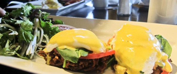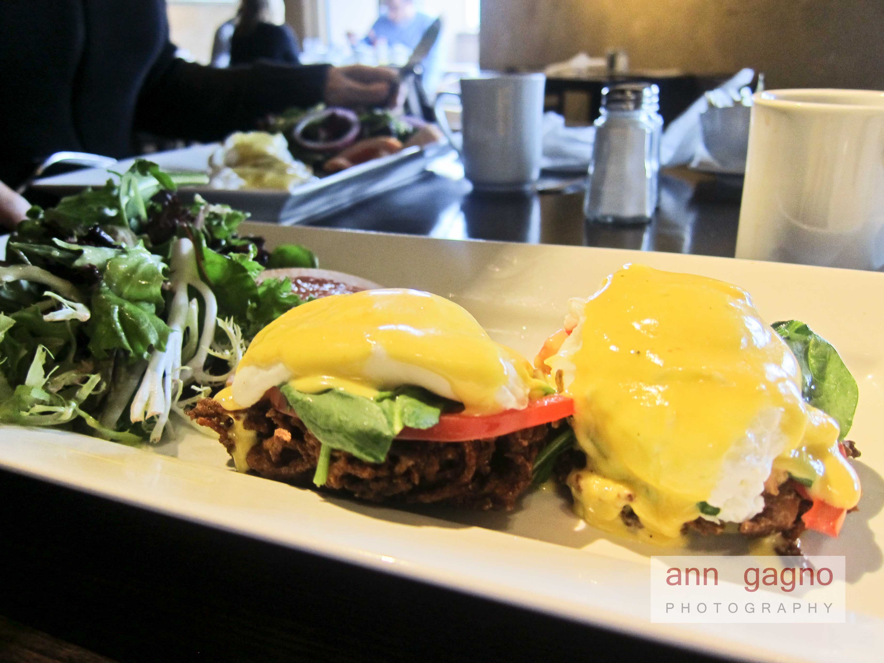 So I was a good 15 minutes late when I showed up at the Harbord House and I found my friend, Valerie, perfectly content, reading her book, sipping good coffee. That was a good sign. I ordered Vegetarian Benedict, two poached eggs sitting on top a sweet slice of tomato and spinach, piled on top of potato pancakes, smothered with hollandaise sauce. Valerie selected Smoked Salmon Benedict, poached eggs piled on top of a slice of smoked salmon and English muffin, also having its generous hollandaise topping.