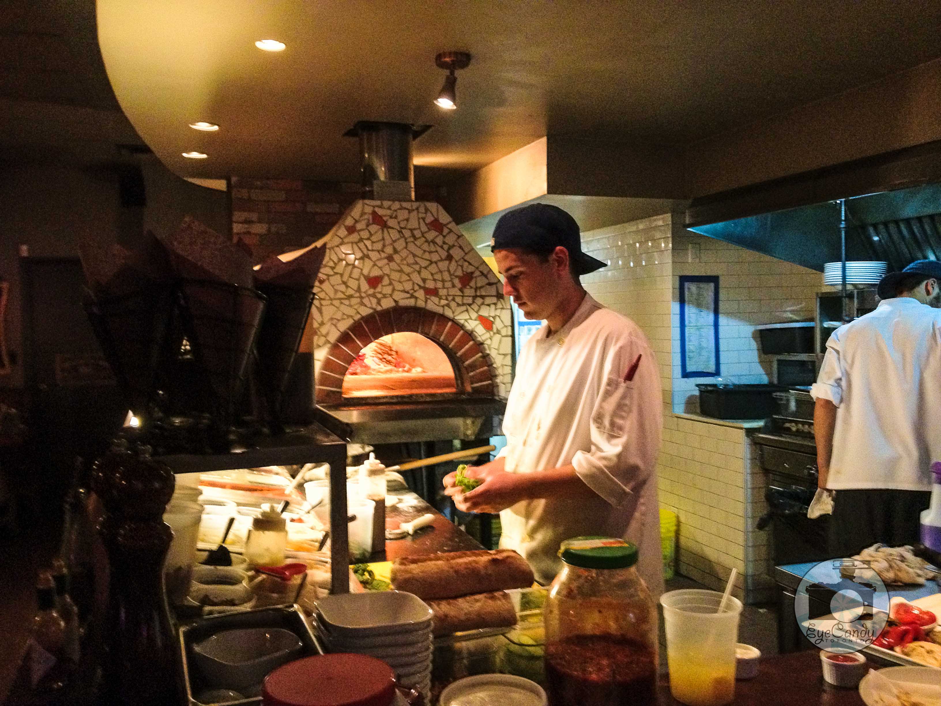 We walked in and both Valerie and I decided it was better to sit indoors where it was quiet and cooler. I loved the warm appearance of the interiors, long bar on one side, tin tiles on the ceiling that bore the warm reflections coming from an ornate chandelier and a row of banquet seating completed the dining area. But nothing was more commanding than the very visible focal point of a wood burning oven at the end of room. I had to fight the impulse to run to it and start snapping pictures. After all, I was supposed to be there catch up with Valerie. Valerie first, pictures of the oven for later. If I know Valerie better, she would remind me to do it. LOL. :D