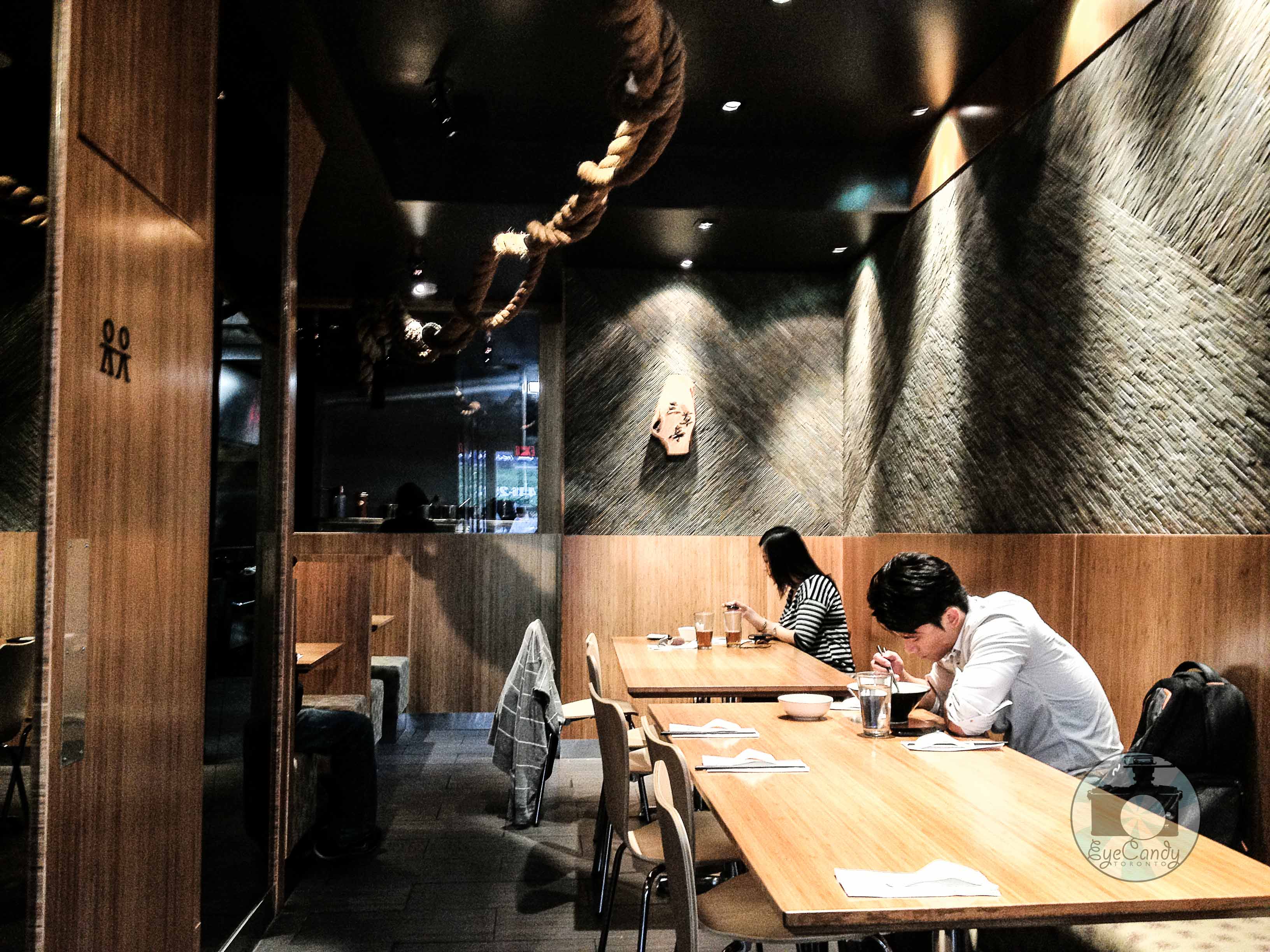 I walked in and saw Diona already waiting for me. It was a good idea to have a late lunch as the place was virtually empty. I know from reading other posts that this place can be full to the brim of ramen-loving foodies just like me. The restaurant was a long narrow space with 6-seater-tables on one side and two booths at the end of the room. The texture of the wall was quite appealing and as was the choice of lighting. I like the contemporary taste of the space that was also peppered with whimsy as there was a fisherman’s rope dangling on the ceiling. As I take my seat, the smell of the ramen served on an adjacent table wafted towards my direction and I can feel my stomach churn. The smell was appetizing enough and I can’t wait to have my own bowl.