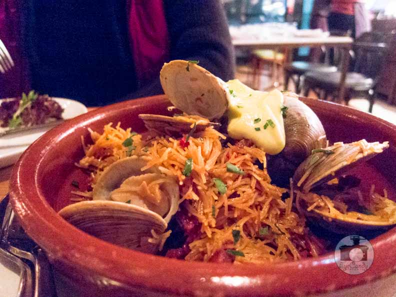 As we were prudent enough to make a reservation, we were led closer to the hot kitchen. It gave a welcoming warmth, adorned with terracotta dishes and serving trays. As we were seated, despite knowing what I wanted to try, I gave the menu a quick scan. My heart skipped a beat when I did not see Fideos Negro on it. Checking with our server, I was told that it was removed just a week ago and that was truly disappointing. Recognizing that it was a lost cause to have a long face through the night, I opted for another dish with fideos, Fideos Con Almejas Y Chorizo (Fideos with clams and chorizo). To that, we also added Ensalada De Alcachofas Con Queso Manchego (salad with crispy artichokes) and a raciones of Croquetas de Jamon.