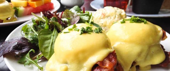 Knowing that I wanted their Breakfast Benny (poached eggs with bacon on potato pancakes with Hollandaise sauce, a side of greens and potato salad), Diona opted for another dish so we can two different items on their menu. She went for Sammy Benny (poached eggs with smoked salmon sitting on waffles, a side of greens and fruit salad). I must say when the plate arrived, I was impressed with the control and perfection of the shape of the poached egg. I recently was taught by my EyeCandyTO partner, Abe Wornovitzky, how to poach an egg and it didn’t come near to the appearance that The Starving Artist’s poached eggs were. Diona gave me more tips how to control the shape of the poached eggs and I believe I’d go do the experimentation soon.
