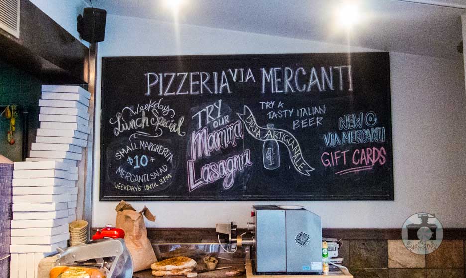 Knowing I had an errand to do by Kensington Market, I searched Urbanspoon to see what would be open for a very late lunch. No matter how much I frequent Kensington, there was still another restaurant that I haven’t been into. This afternoon, I was in the mood for pizza and I headed towards Pizzeria Via Mercanti. Knowing that my friend Diona’s Kanto was just close by, I decided share it with her and ordered the pizza to go.