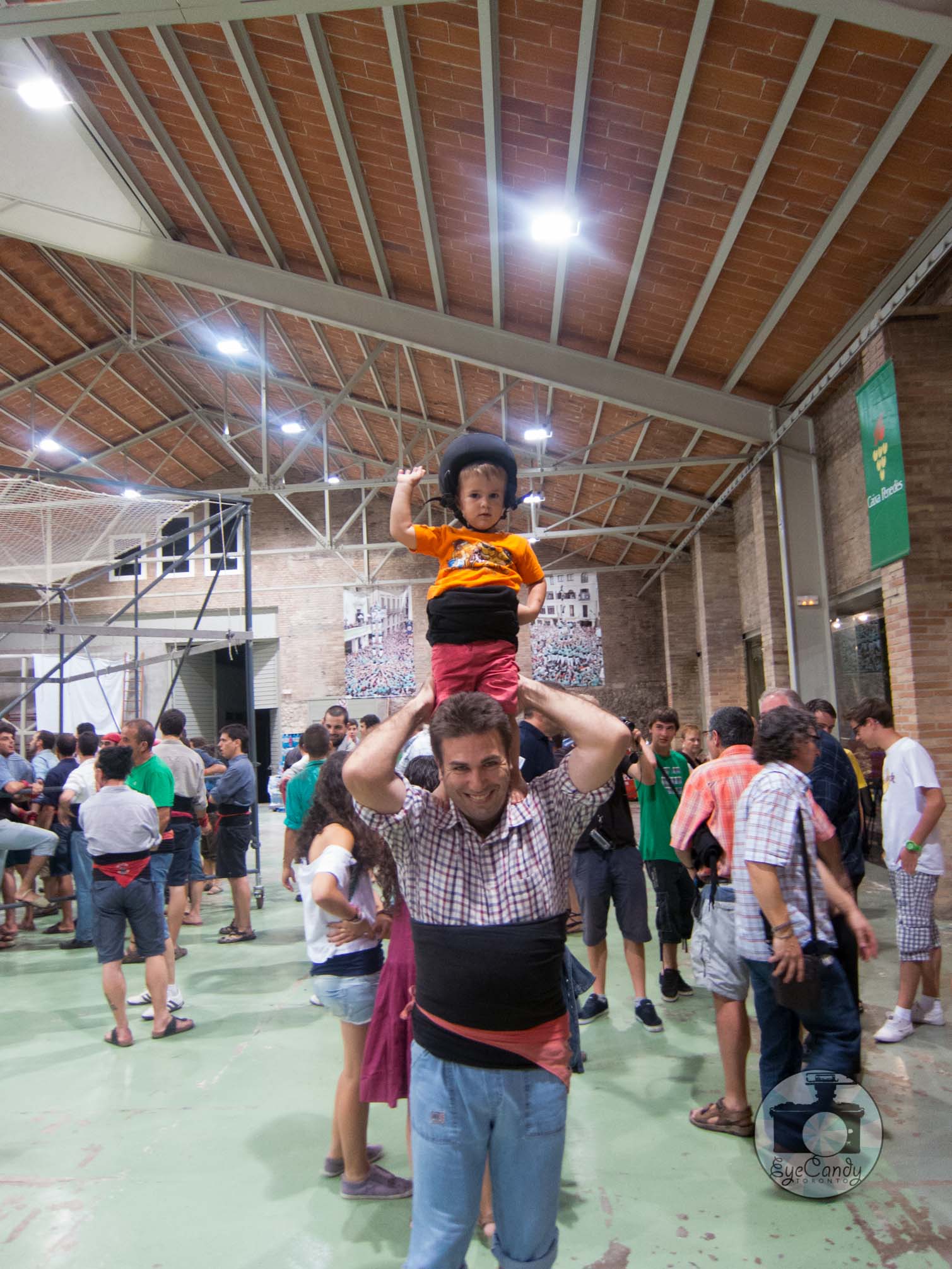 The day of the rehearsal finally came and we went about the building dedicated solely for the tradition of the Casteller. There was a thick crowd of both participants and spectators like me. It was like watching the main event itself. As I was milling about trying to find interesting things to take pictures of, one little boy caught my eye. As most of them are doing, it was the camera that he was most curious about. He would furtively look at me and went about his way, always checking if I am still following him around with my camera. It seemed like he was quietly telling me to take pictures of his attempts of being an anxaneta. He could be no more than 5 years old and I found out later from his mom that he was almost four. I found it too cute as he tried to put on his helmet, refusing help to show how big a boy he was. And then he was suddenly in a conversation with an adult, probably a matter-of-factly saying he wants to climb to the top like the best anxaneta around. I wished then I could understand Catalan. After the conversation was through, he swiftly climbs the back of whom I assumed was his father and then both turned around and he gave me a smile and a wave that the tower is complete just like a very well-trained anxaneta. It was the moment when I realized that I don’t need words to communicate.