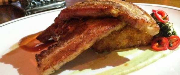 Pork Belly – Slow braised pork belly with crusty smoked mac n’ cheese with brocoli purée and pickled chilis