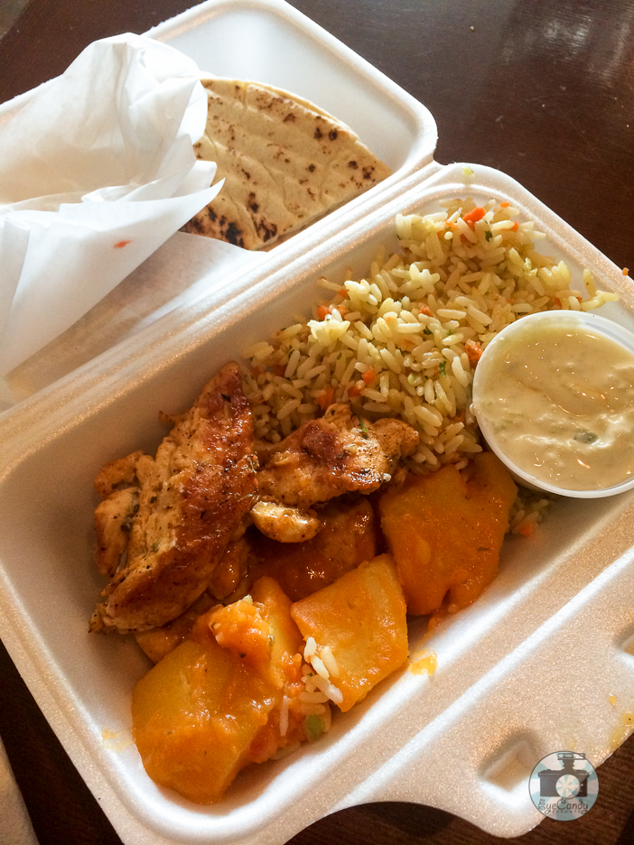 It wasn’t long when I was given a big bowl of greek salad brimming with copious strands of feta cheese. It was a meal on its own. Then it was followed with a very aromatic warm pita bread. Hot off the grill, my stomach shamelessly grumbled as the smell wafted my way. Just the two was enough to fill me. And then I remembered that there was the chicken souvlaki with a side of rice and potatoes that was supposed to come. I wondered how could I possibly finish all of it? You can see in my slideshow, that is about how much I brought home after eating. The nuggets of juicy chicken was delicious but I was too full to finish it.
