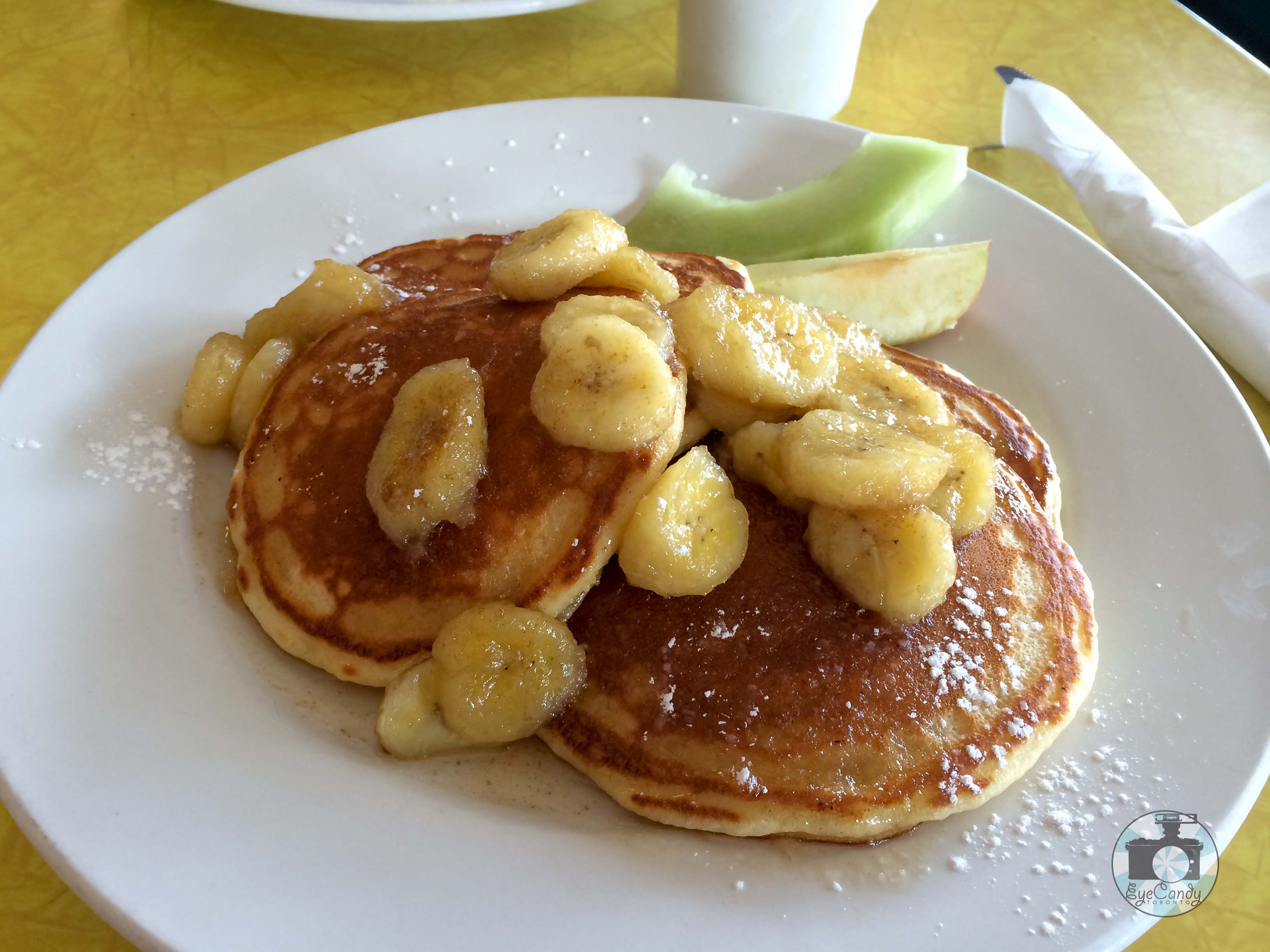 What made The Bus Terminal stand out to me was that in every review I read from various apps, it was consistently mentioned as a go-to place at the Danforth. Reading the multiple reviews, no one could miss the buttered banana pancakes. Just seeing the picture made me imagine the sweetness of the bananas, like syrup to the pancake. I wondered how spectacular it must be to pair it with something salty and I was in the mood for breakfast sausages. So when I walked in this retro diner, I could almost taste it.