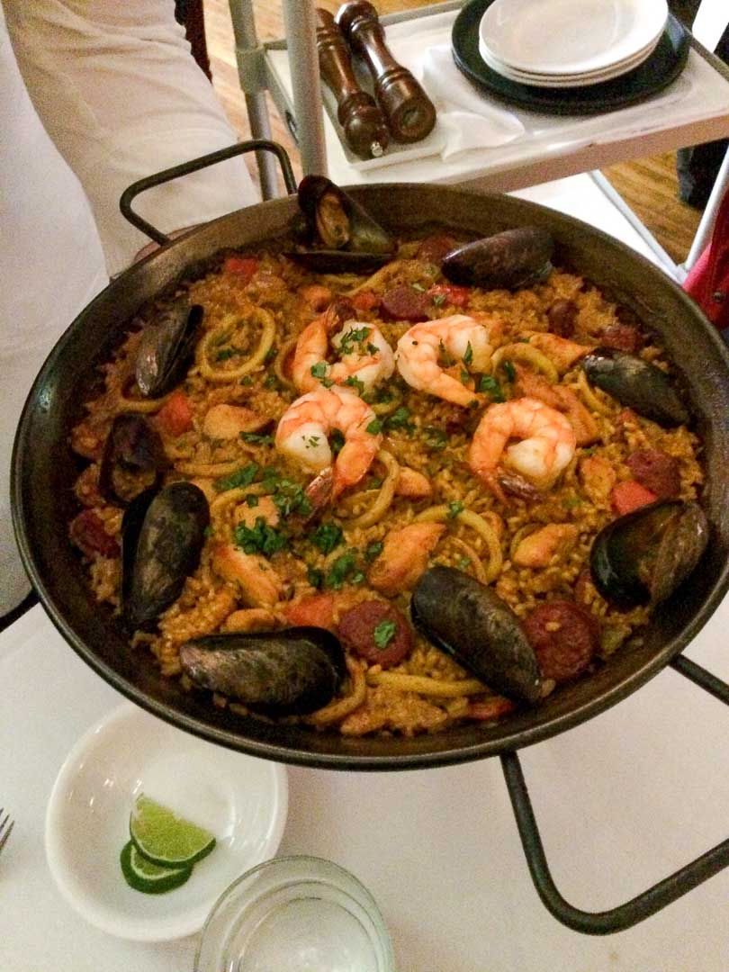 When my friends Arsha and Monika arrived, they were as elated as me loving the ambience of the restaurant. They know we were there to try paellas but it didn’t stop us from ordering three appetizers. We went for the Calamares a la Plancha (Grilled Calamari with Chilli oil), Jamón & Lomo Ibérico (Spanish ham) and Baked Spinach with Goat Cheese. For our mains, we chose Paella Valenciana (Paella with Chorizo, Chicken and Seafood and Fideuá (Catalonia Style Pasta with Shrimp, Calamari, Scallops and Monkfish).